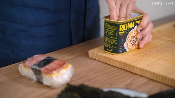 ここからがポイント!リチャムが入っていた缶にラップを敷き入れ、ごはん→缶のサイズにカットした玉子→スパムの順番で重ねていきます。崩れないようにしっかり押さえるときれいな形に仕上がりますよ。最後にラップごと缶から取り出し、海苔を巻きつけたら、スパム風おにぎりの完成です♪すぐに食べない分は一つひとつラップで包み、チャックつきの保存袋に入れて冷凍保存しましょう。