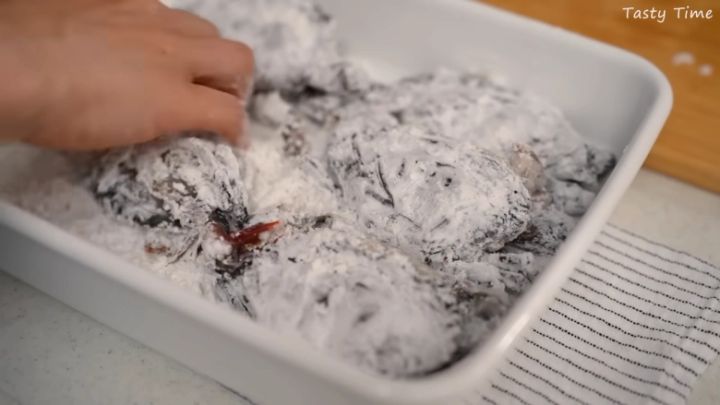 今回は唐揚げに挑戦。バットに片栗粉、ガーリックソルト、黒こしょうを入れて混ぜます。解凍したソフトシェルクラブに粉をまぶし、170℃の油で8分程度揚げましょう。
