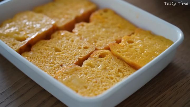 大容量なので、すぐ食べる分以外の余ったパンはフレンチトーストにするのもおすすめ。卵に牛乳、アガベシロップを加えて作った卵液をチーズブレッドに染み込ませ、タッパーに入れて冷凍保存します。食べるときは、冷凍のままバターを引いたフライパンで焼くだけで完成です。