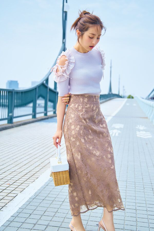 フェミニンスタイルに欠かせない、 総レースのスカート。トレンドのカットアプトニットを上手に取り入れて、程よい肌見せを叶えて。