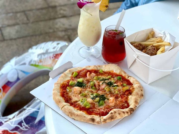 プールサイドの洞窟風の「グロットバー」では、ドリンクやフードをオーダーすることができます。今回は「ガーリックシュリンプとアボカドのピザ」と「餅粉チキンとポテトのフリット」をチョイス。ピザは、シュリンプがたっぷりのっていて、エスニックな味わいで、夏にぴったりなメニューです。