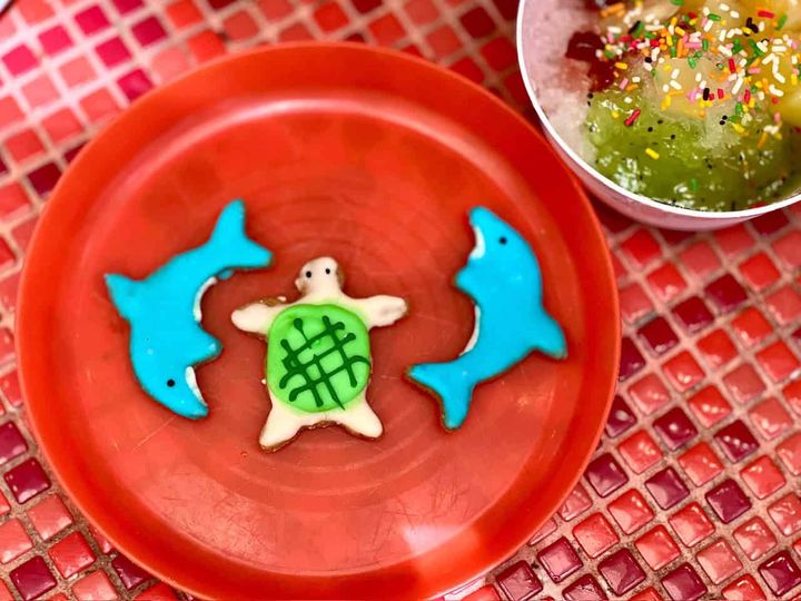 子ども達が大喜びのイルカやカメの形をしたカラフルなクッキーもあります。ソースやフルーツをのせて、自分で作るオリジナルのかき氷も楽しいです。