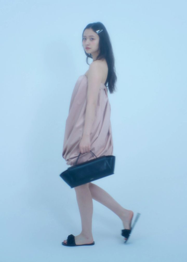 ベアワンピース 121,990円/エレイン ハースビー(エンメ)サンダル 12,100円/メリッサ(メリッサ シューズ ジャパン)バッグ 134,200円/ジュンジー(コロネット)ヘアピン(2個セット)1,430円/アネモネ(サンポークリエイト)