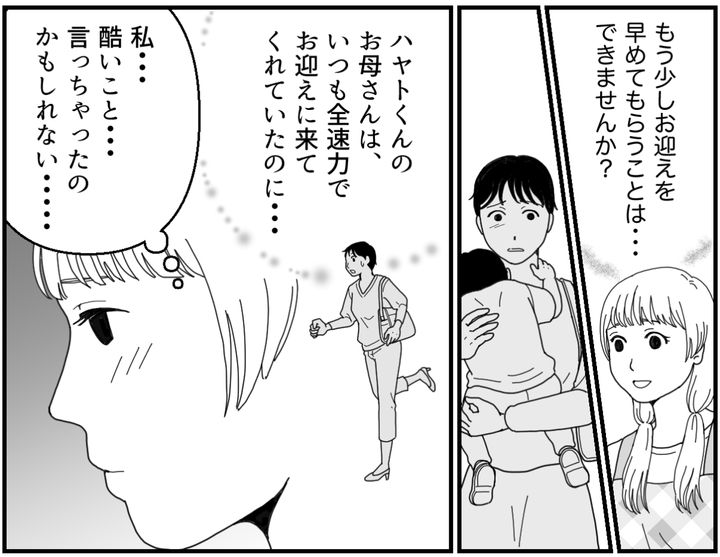 ハヤトくんのお母さんはいつも全力で走って保育園に駆け込んできます。ハヤトくんのため、1分でも1秒でも早くお迎えに来たいと思ってくれているはず。私はあまりに安易に発言してしまったことを、後悔してもしきれなかったのでした。