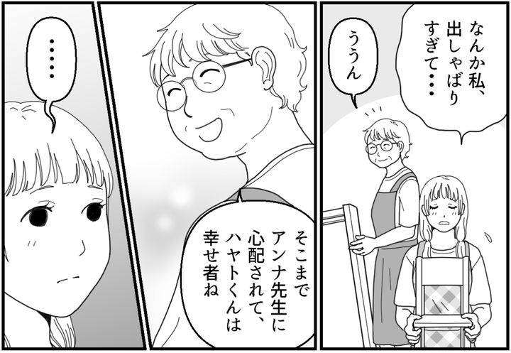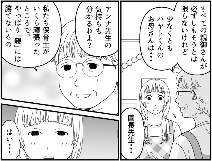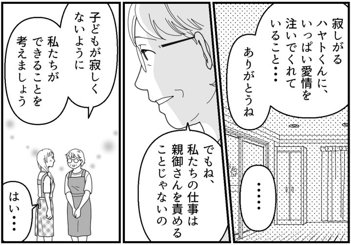 園長先生に言われ、私はハヤトくんの家庭に踏み込みすぎてしまったことに気が付きました。いくら寂しがっているハヤトくんが辛そうで見ていられなかったとはいえ……保育士として行きすぎた発言でした。園長先生の言葉が心に突き刺さり、自分の言ったことが急に怖くなってしまいます。