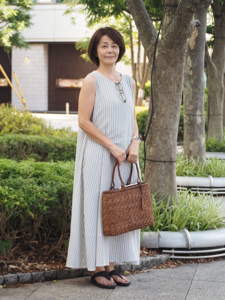 ノースリーブのストライプワンピースはエミさんの夏の定番。縦のラインを強調する細めのストライプとAラインシルエットで体形カバーも叶う一着。「夏は一枚で過ごせるアイテムがやっぱりいちばん。裏地付きで透け感も気にならないので大活躍しています」。足元はコンフォートサンダルでリラックス感のある装いに。