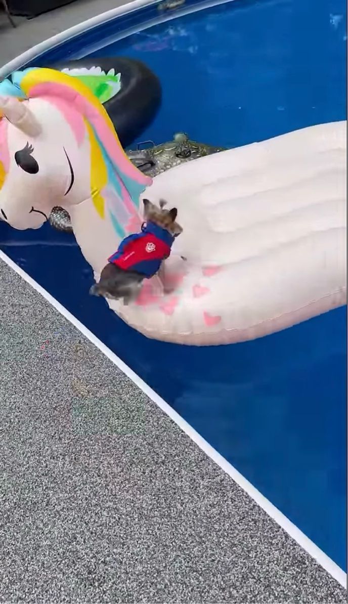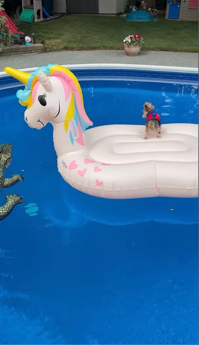 3. 「よ~し、泳ぐぞ~!」と張り切っているヨークシャーテリア?全力で向かった先はリラックスできるエアーマットでした!【海外・動画】