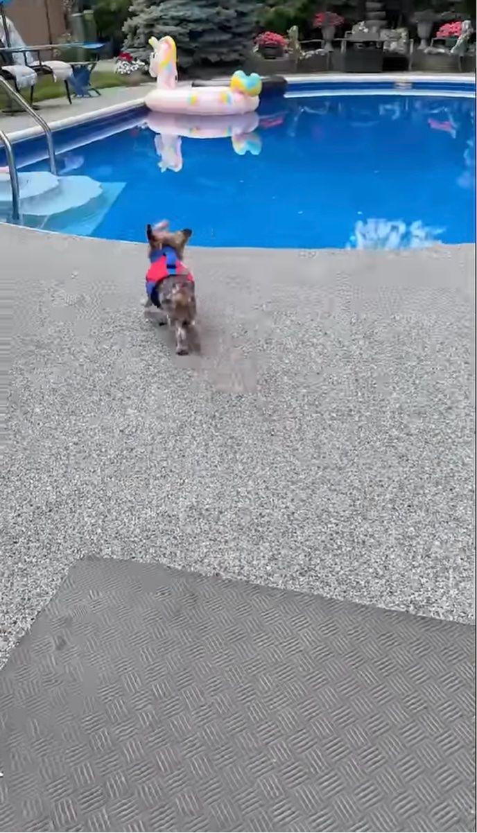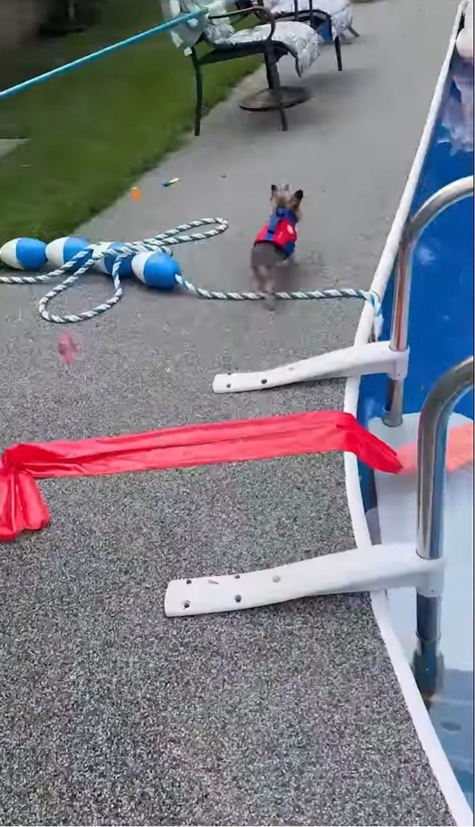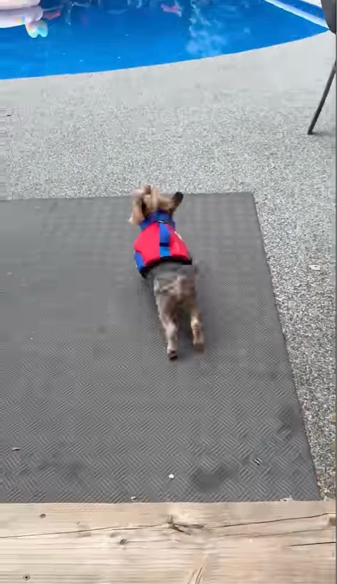 ライフジャケットを装着して、プールへ一直線に向かっていくヨークシャーテリア。 その姿はまるで「よ~し、泳ぐぞ~!」と張り切っているように見えますが・・・!