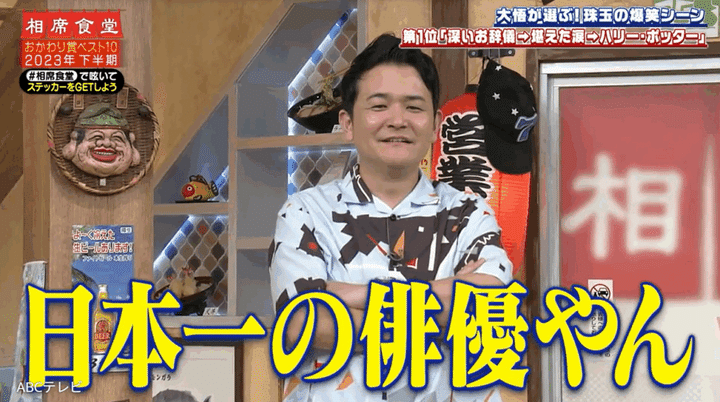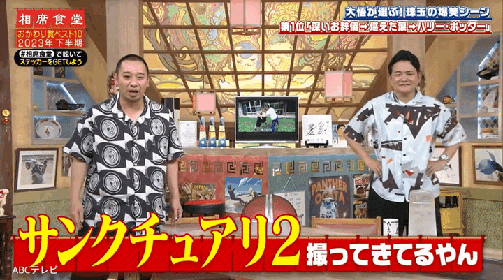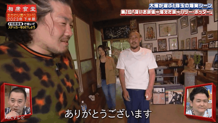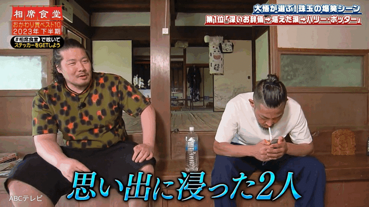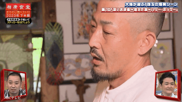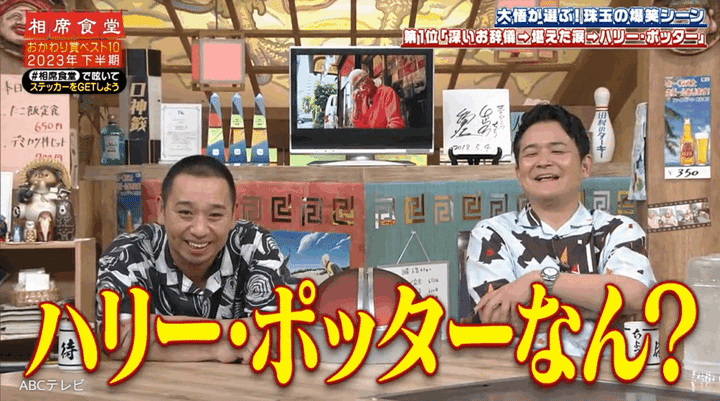 なお、大悟が「深いお辞儀→堪えた涙→ハリー・ポッター」と命名したこの一連の名場面(︎2023年8月8日オンエア)は、『相席食堂』 8月12日放送回で再び公開された。おかわり賞とは、大悟が「もう一度見たい!」と思った『相席食堂』のVTRに贈る賞のこと。同放送回では、「大悟が選ぶおかわり賞ランキングベスト10~2023年 下半期編~」が発表された。