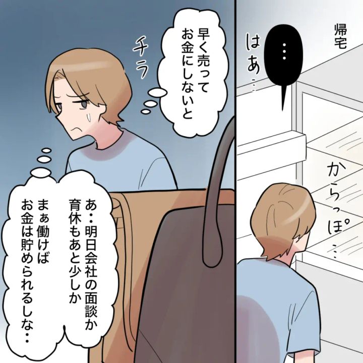 そして帰宅。冷蔵庫を覗くもからっぽ。「はぁ・・・」思わずためいきが出るオサムは、「早く売ってお金にしないと。あ・・明日会社の面談か。育休もあとすこしか。まぁ働けばお金は貯められるしな・・」と呟きました。