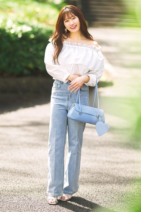 オフショルブラウス¥15,400/ストロベリーフィールズ(シュガー・マトリックス) デニムパンツ¥12,980/RANDA バッグ¥11,000/dazzlin イヤリング¥3,740/アネモネ(サンポークリエイト) サンダル¥20,900/タラントン by ダイアナ(ダイアナ 銀座本店)