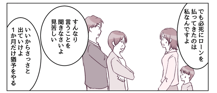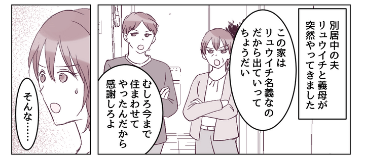 いきなりリュウイチと義母に離婚を言い渡され、「マンションを出ていけ」と言われてしまいました。ローンを払ってきたのは私なのに……。リュウイチは「むしろ今まで住まわせてやっていたんだから感謝しろよ」と冷たく言い放ちます。