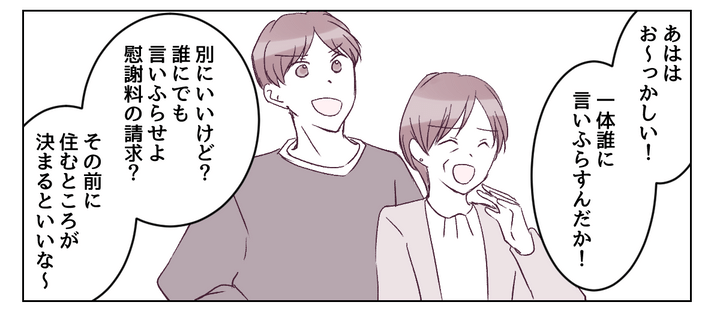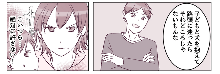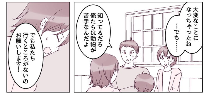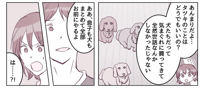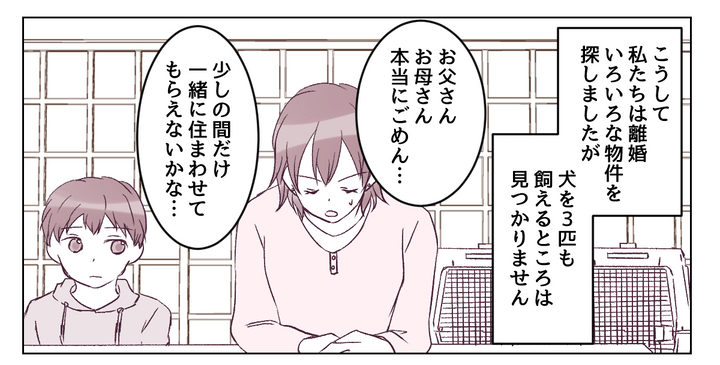 あまりの仕打ちに「言いふらしてやる!」と怒鳴り返しましたが、リュウイチは義母とともに大笑い。絶対に許せません。結局は実家の両親に頭を下げて頼み込み、期間限定で住まわせてもらうことに……。タツキと3匹の犬たちを簡単に捨ててしまえるリュウイチに、私は言葉で言い表せないほどの怒りをおぼえていたのでした。