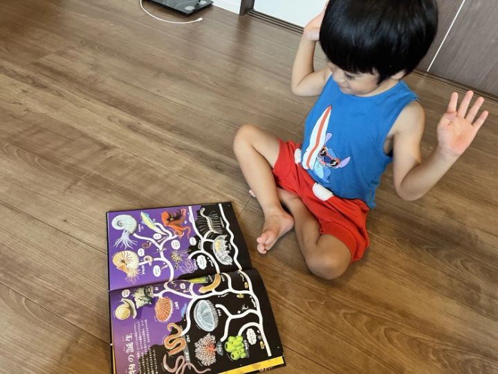 でも次のページにつながっていく生物をみると「すごいねぇ!」と感激の様子。命のつながりを息子なりに理解し、好奇心をもって学んでいるんだと感じる瞬間でした。