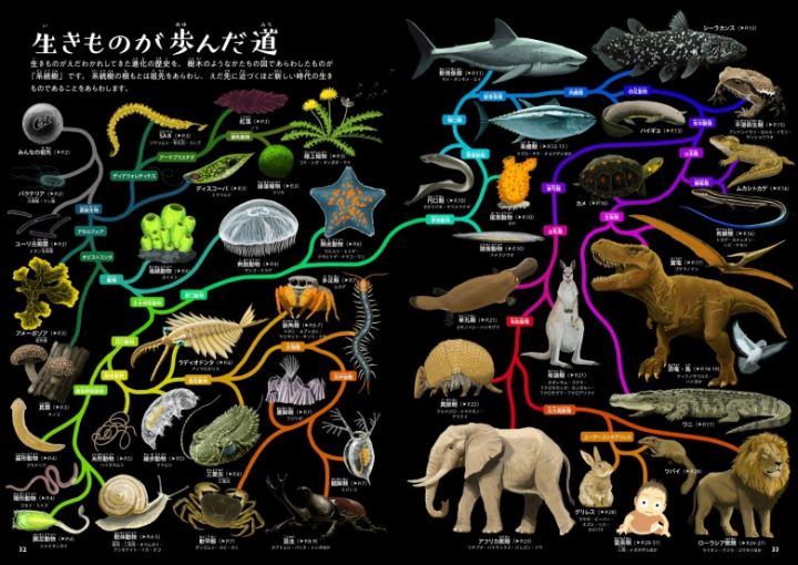 生命の誕生から人間の誕生まで、さまざまな生き物たちが登場します。その系統樹をたどっていくと、最後は人間につながることにも、息子はびっくりしていましたね。