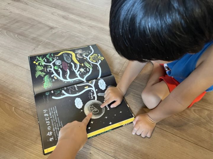 この新感覚ともいえる『ゆびでたどる進化のえほん』。これは親子で楽しめるだけでなく、進化について学べるので、手にしてからは子どもと一緒に、おうち時間に私もよく見ています。
