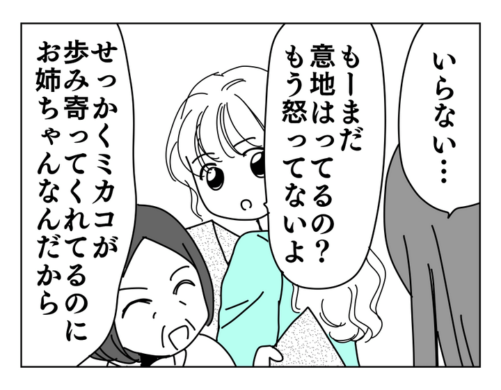 頼んでないのに持ってきて、感謝しろとか恩着せがましい……。キレないで冷静に対応できるキョウカさんが素晴らしいです。きっとずっとこうやってミカコさんの勝手に耐えてきていたのでしょう。さらに実母さん、ここへきても「お姉ちゃんなんだから」って……。あなたそれしか言うことないのー? っていうくらい連呼しますね。けれどさすがタクヤさん! 「『お姉ちゃんなんだから』ってずるい言葉ですね」と核心をついてくれます。タクヤさん、もっと言ってやってください――!