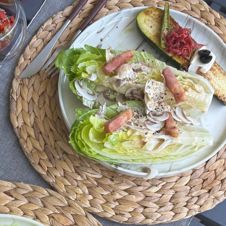 普通ならここにパンやスープを添えるところですが、この日は野菜オンリーで。縦半分にカットしたロメインレタスに薄くスライスした生のマッシュルームを惜しみなくふりかけ、厚切りベーコンを散らせばもう完成。