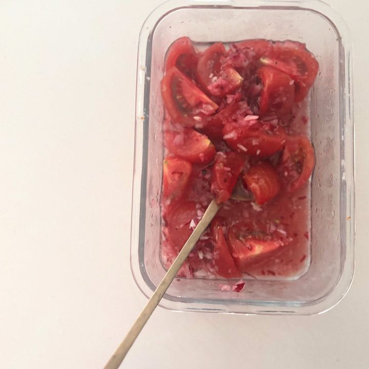 串切りにしたトマトをみじん切りの紫玉ねぎと合わせます。お酢とオリーブオイルを2:1でさっとマリネすれば、爽やかな酸味とやわらかな甘みが口いっぱいに広がる冷たいサラダの出来上がり。トマトは湯向きすることで味がより一層しみ込んで美味しいんですよ。