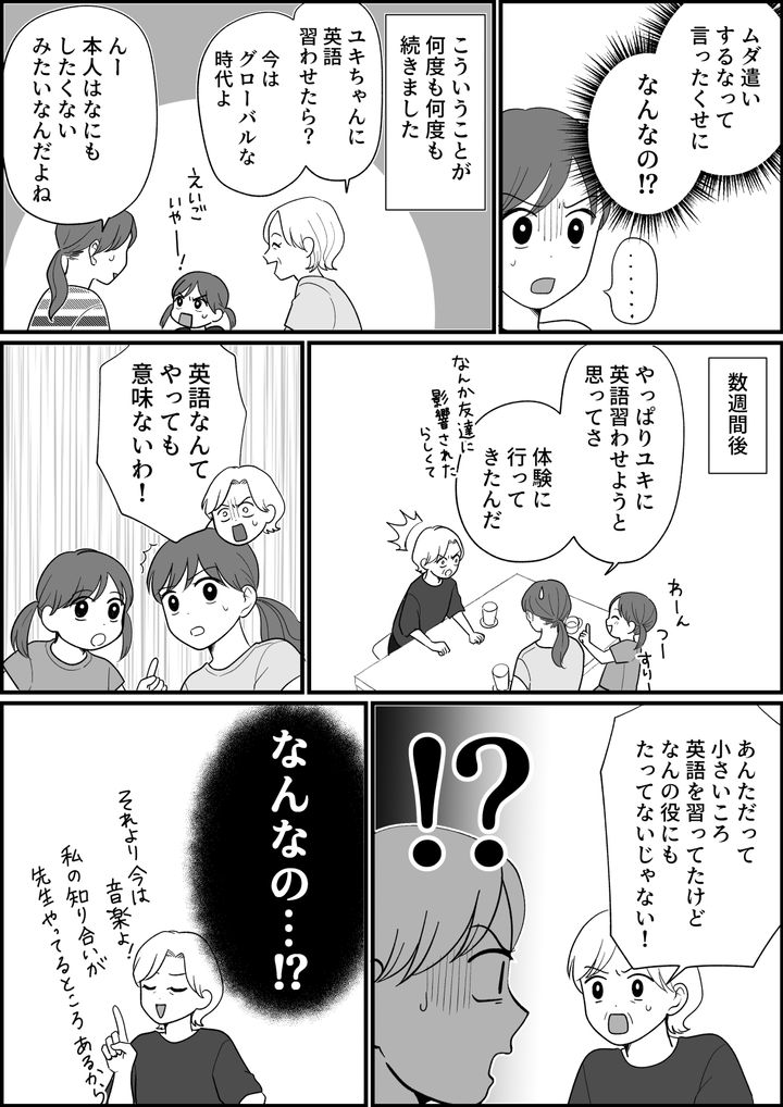 ユキに英語を習わせろと言うから体験にも行ってきたのに「ちがう、時代は音楽よ」なんて言ってくる母。母は……私がさらっと話したことも、こまかく注意してきます。私は注意されたから真剣に考えて改善するのに、次に会ったときは意見を変えてくるのです。