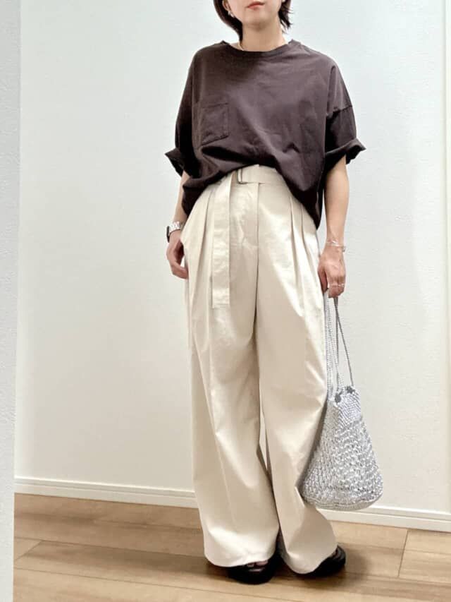 ▲きちんと感とラクさを両立。ベルト&タックで美脚見えも叶います