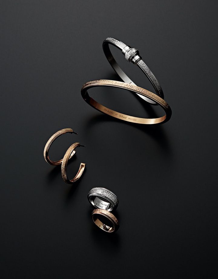 上から:〈ポセション〉ブレスレット[K18WG×DIA]¥1,619,200、同 ブレスレット[K18PG]¥1,020,800、同 イヤリング[K18PG]¥726,000、同 リング[K18WG×DIA]¥1,249,600、同 リング[K18YG]¥352,000(全てピアジェ/ピアジェ コンタクトセンター)