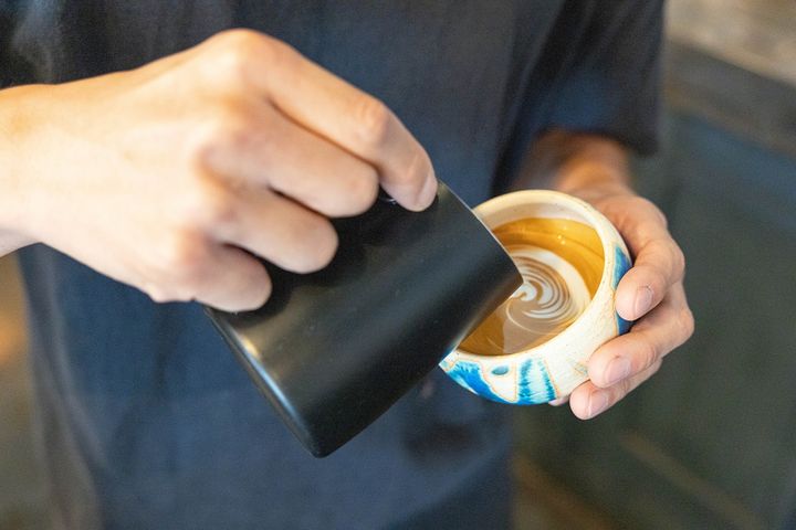 「ラテ」のカップは志陶房(こころざしとうぼう)による「rokkan COFFEE」オリジナルカップ夏至南風(かーちべー)。