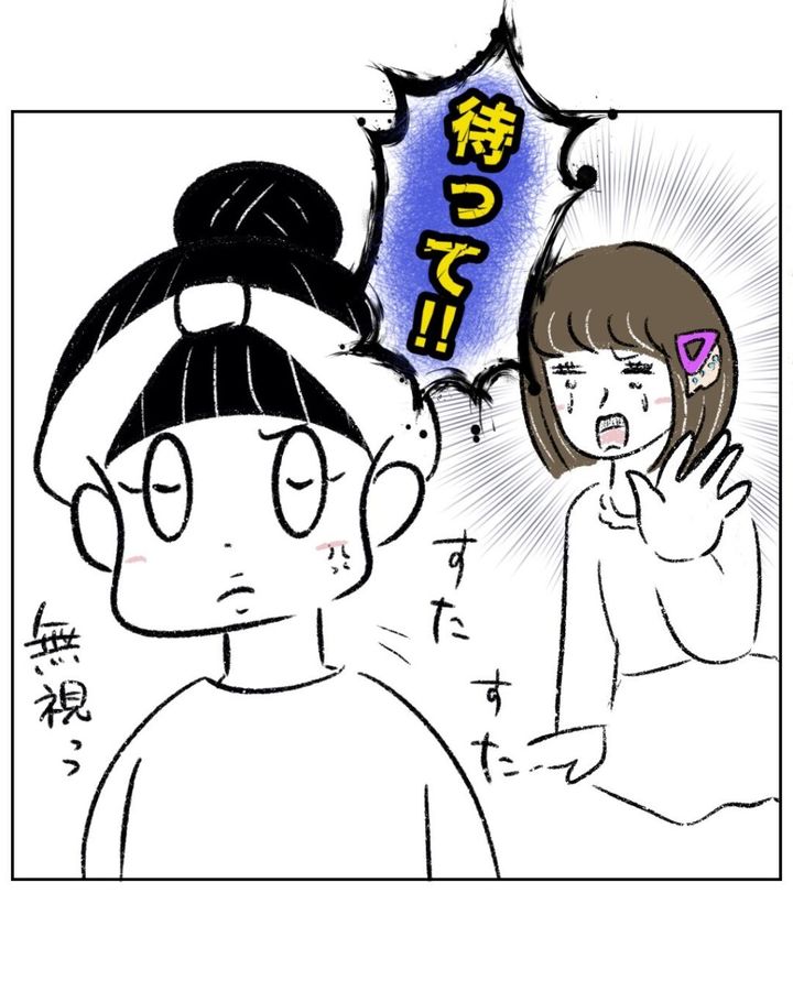 話も関係ももうおしまい、という気持ちでゆかちゃんママに言い切ると、くるりと回れ右してアキくんの元へ歩き出しました。ゆかちゃんママが「待って!」と大声で叫んでももう無視を決め込みます。