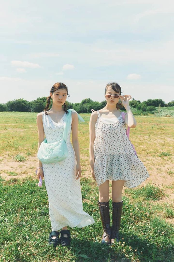 〈左・紗来〉花柄キャミワンピース 4,949円/W♥C キャミソール 2,490円、ロングブーツ 4,490円/ともに神戸レタス サングラス 990円/WEGO バッグ 4,180円/Lazy Styles(PLAZA)〈右・紅葉〉ドットギャザーワンピース 14,300円/Darich(YSM)バッグ 7,130円/BITTERCELLS(HANA KOREA) 手に持ったミニハンディファン 3,410円/PLAZA スニーカー 15,400円(8月 発売予定)/merry jenny リボンヘアクリップ/スタイリスト私物