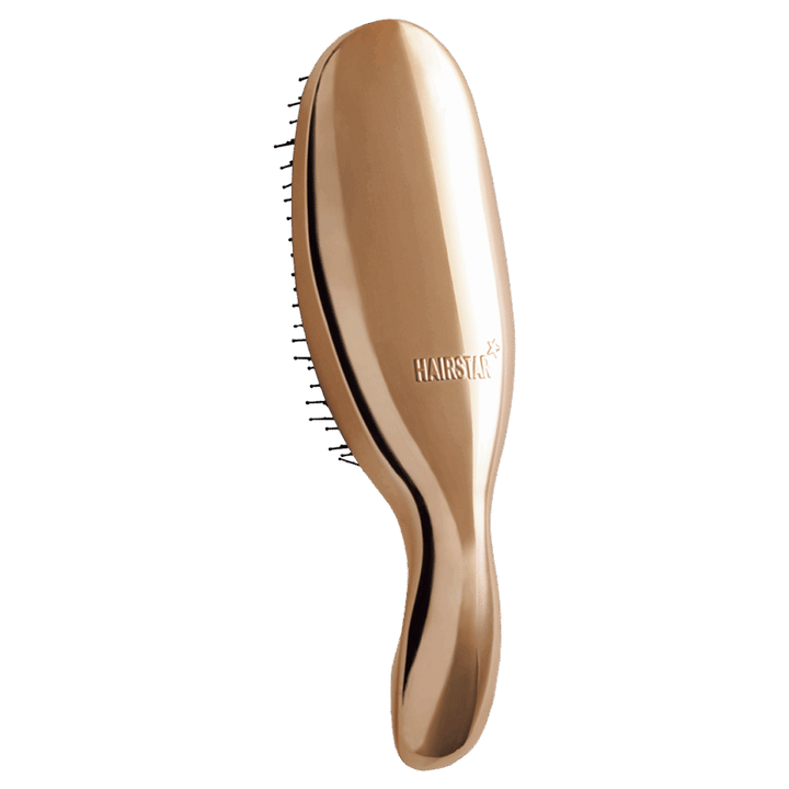 マイナスイオンを発することで広がりの原因となる静電気から髪をガード。潤いとツヤももたらす。ヘアスター イオンスターブラシ ピンクゴールド ¥3,960(LIFELONG)