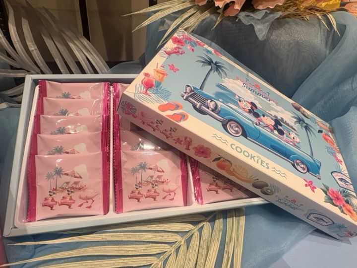 夏の装いのミッキーたちがプリントされている紙箱のクッキー。