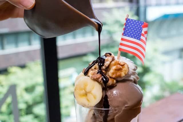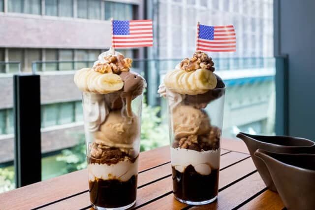 ▲たっぷりのバナナやクルミなどがトッピングされ星条旗も飾られます