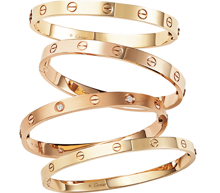 「LOVE」ブレスレット、上から:[YG]¥1,174,800、[PG]¥1,174,800、[PG×DIA※ブラッシュ仕上げ]¥1,887,600、[YG]¥968,000(全てカルティエ/カルティエ カスタマー サービスセンター)