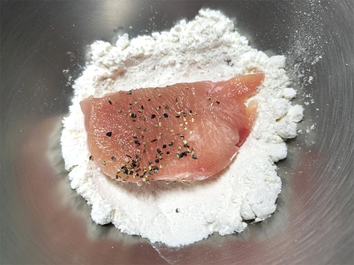 5. 鶏肉に薄力粉(分量外)をまんべんなくまぶし、余計な粉は落とします。
