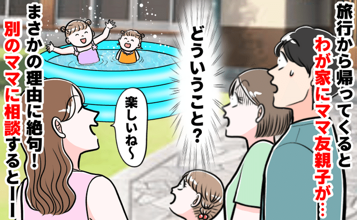 そんなある夏の日。家族旅行から予定より早く帰宅すると、誰もいないはずの庭から水の音と子どもの声が聞こえてきました。不審に思ってのぞいてみると、なんとそのママ友が自分の子どもを連れてアポなしでわが家を訪れ、駐車場から勝手に庭へ入り、出しっぱなしだったビニールプールを使って遊んでいたのです。