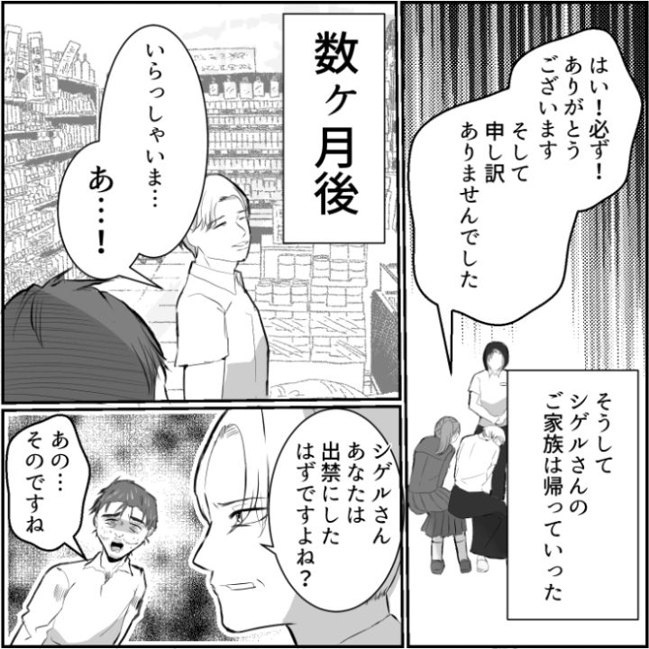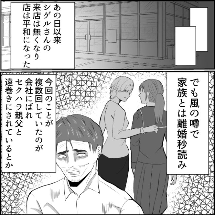 家族がいるにもかかわらずセクハラをし続けたシゲルは全てを失う自業自得の結果になった一方でお店には平和が戻ったようです。