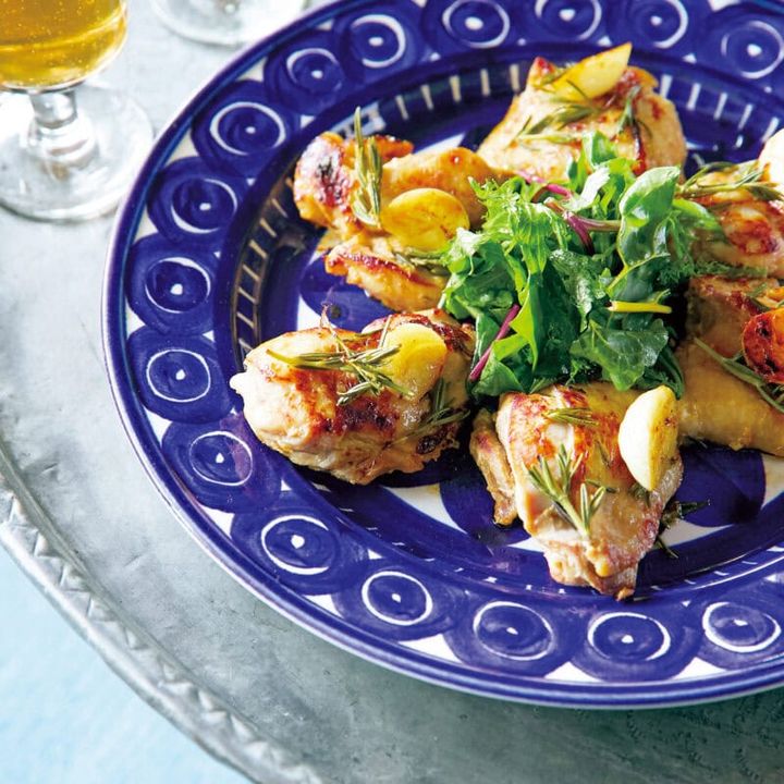 3. フライパンにオリーブ油を強火で熱し、鶏肉を皮目を下にして並べ入れ、にんにくを加える。鶏肉が色づくまで1~2分焼き、弱めの中火にして3分ほど焼く。鶏肉、にんにくの上下を返して弱火にし、鶏肉の上に長さ2~3㎝に切ったローズマリーをのせる。ふたをして4分ほど蒸し焼きにし、器に盛る。Aをさっと混ぜ合わせ、添える。