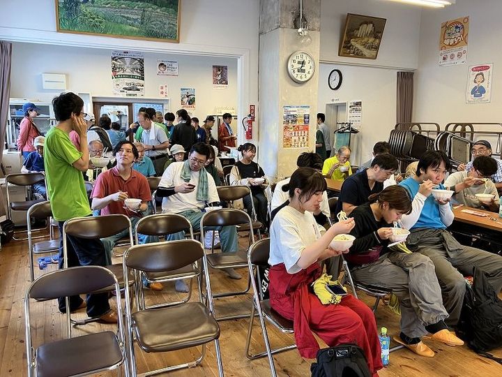 一緒に汗をかいた幅広い世代の参加者たちが、うどんを食べながら談笑していた