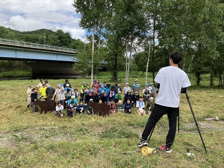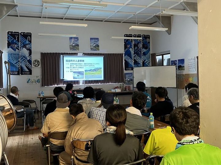 勉強会で、学生は「先ほどみなさんが河川敷にいたときも、クマの等身大パネルが隠れていることに気づいた方は少なかったのではないでしょうか。私も気づきませんでした」と語りかけました。