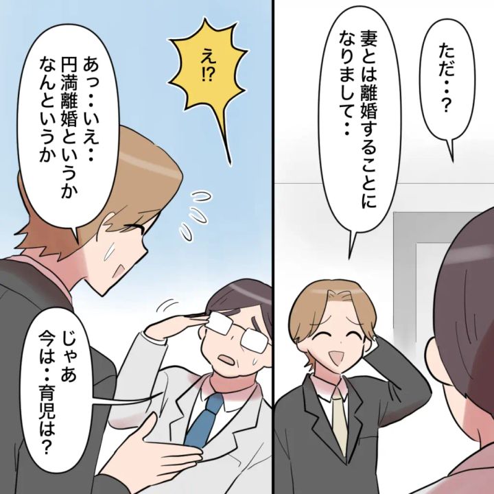 「ただ・・?」と聞き返され、「妻とは離婚することになりまして・・」と言うオサムに、「え!?」と驚きを隠せない担当者。「あっ・・いえ・・円満離婚というかなんというか」オサムの言葉に「じゃあ今は・・育児は?」と聞かれると、