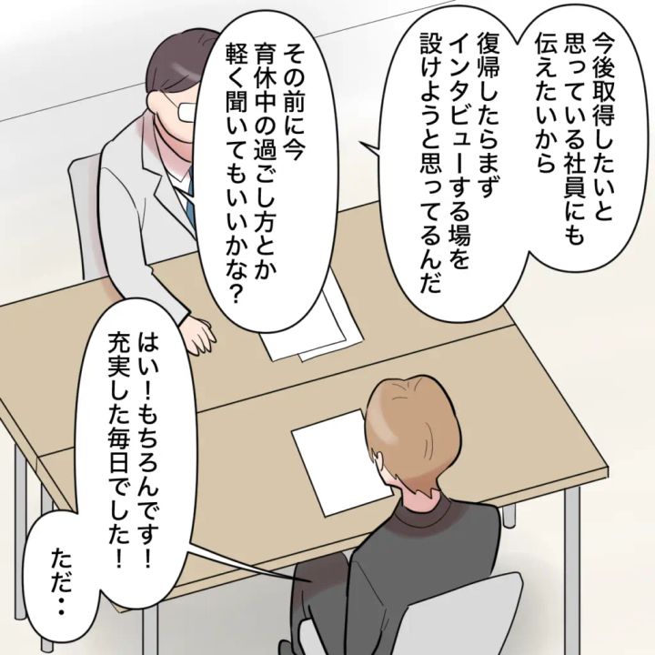 「今後、取得したいと思っている社員にも伝えたいから、復帰したらまずインタビューする場を設けようと思ってるんだ。その前に、今育休中の過ごし方とか軽く聞いてもいいかな?」そう言われ、「はい!もちろんです!充実した毎日でした!ただ・・」