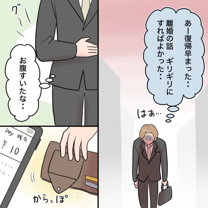 「あー復帰早まった・・。離婚の話ギリギリにすればよかった・・」とため息をつきながら歩くオサムは、「お腹すいたな・・」と鳴り響くお腹を押さえながら財布を確認。でも・・空っぽでした。