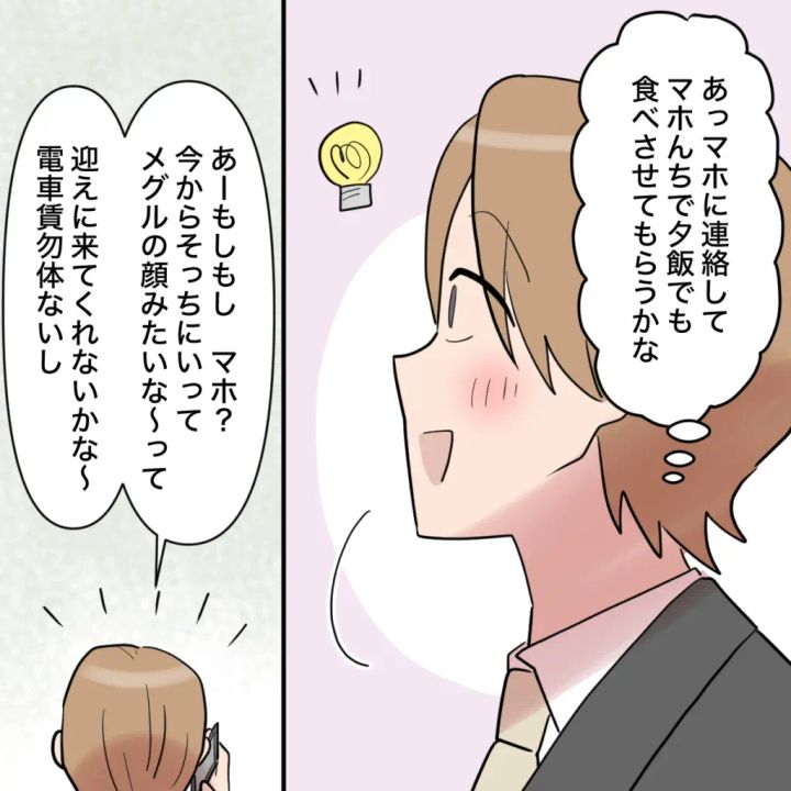 「あっ、マホに連絡して、マホんちで夕飯でも食べさせてもらうかな」とひらめいたオサムは、「あーもしもしマホ?今からそっちにいって、メグルの顔見たいな~って。迎えに来てくれないかな~。電車賃勿体ないし」とすぐに電話で言いました。