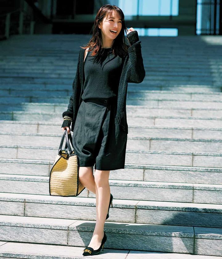 スカート風ラップフォルムでヘルシーな女らしさを仕込んで。リネンパンツにサマーニット、ざっくり編みカーデと夏素材同士を重ねてALLブラックに表情を。着心地も抜群だからハードな一日もストレスフリー。