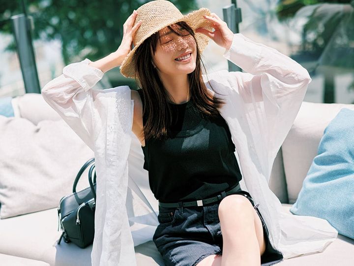 デニムパンツ¥35,200(エーゴールドイー/シチズンズ・オブ・ヒューマニティ)シャツ¥25,300(プランクプロジェクト/プランクプロジェクト 青山店)レイヤードタンクトップ¥33,000(ゲミニー/ウィム ガゼット 玉川髙島屋S・C店)ベルト¥12,100(レフィエ/フラッパーズ)バッグ¥53,900(ヴァジック/ヴァジックジャパン)サンダル¥59,400(ブレンテッラ/ハウス オブ ロータス)ハット¥24,200(ラック オブ カラー/ジャック・オブ・オール・トレーズ プレスルーム)