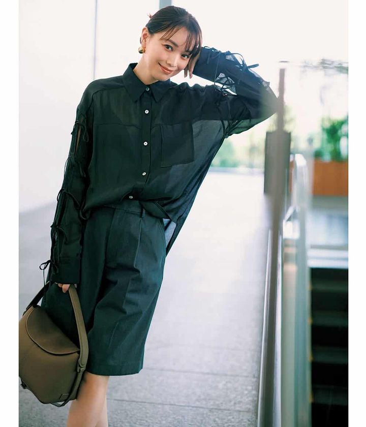 パンツ¥19,800(ザ シンゾーン/シンゾーン ルミネ有楽町店)シャツ¥17,930(メゾンスペシャル/メゾンスペシャル 青山店)バッグ¥58,300(ヴァジック/ヴァジックジャパン)ピアス¥31,900(ミショー/ハウス オブ ロータス)