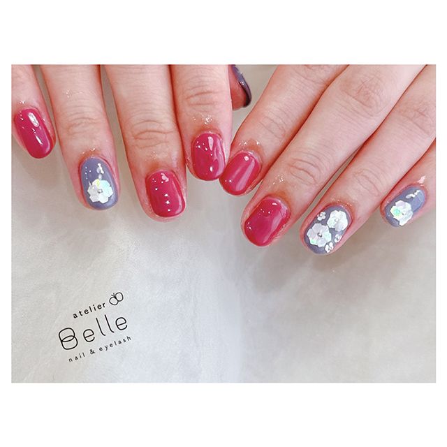 【大人ネイル】グレーとボルドーにお花アートで個性的な指先に