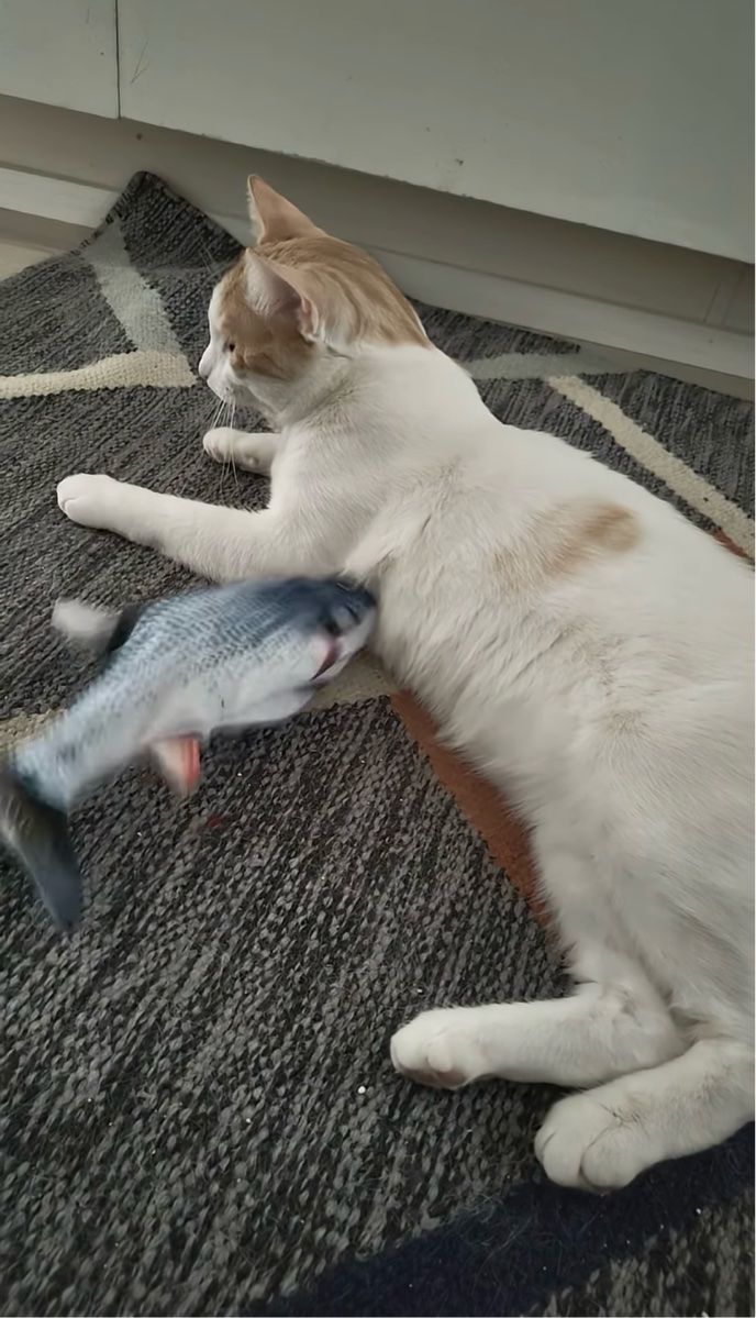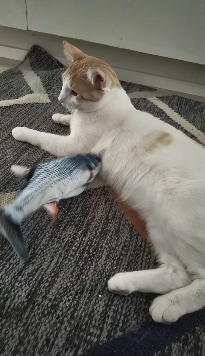 3. 温度差がシュール。魚のオモチャが懐に入り込もうとしているけれど・・ネコは無反応!?【海外・動画】