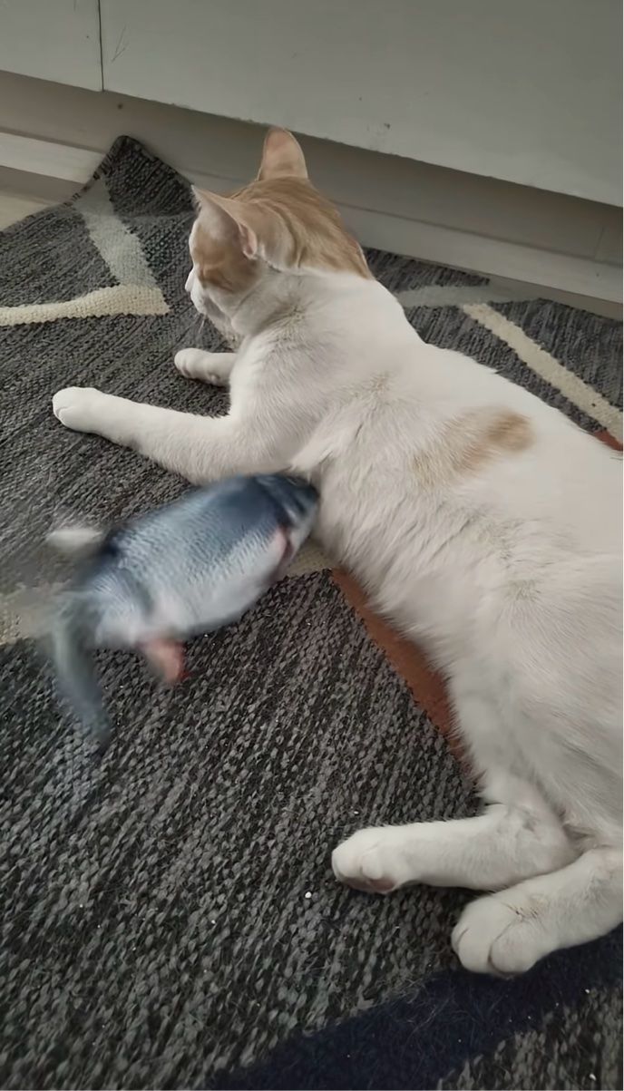 ネコの懐に入り込む勢いでピチピチ跳ねる魚のオモチャ。 しかし、当のネコはオモチャに興味がないようで完全にスルーしていたのでした。