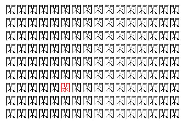 画像の中には、「閑」という漢字が縦に9行、横に16個並んでいます。 全部で144個となりますが・・・、そのうち1つは「異なる漢字」となってますよ!!
